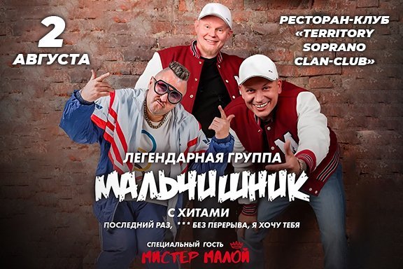 Иркутск встречай! 2 августа в ресто-клубе территория Сопрано, первая рэп группа СССР! МАЛЬЧИШНИК! Ребята исполнят «НОЧЬ», «СЕКС БЕЗ ПЕРЕРЫВА», «ПОСЛЕДНИЙ РАЗ» и все хиты которые полюбили мы 30 лет назад!!! Но это ещё не всё!!! Специальный гость Мистер Малой!!! «БУДУ ПОГИБАТЬ МОЛОДЫМ» !!! Спешите. Количество мест ограничено!!!